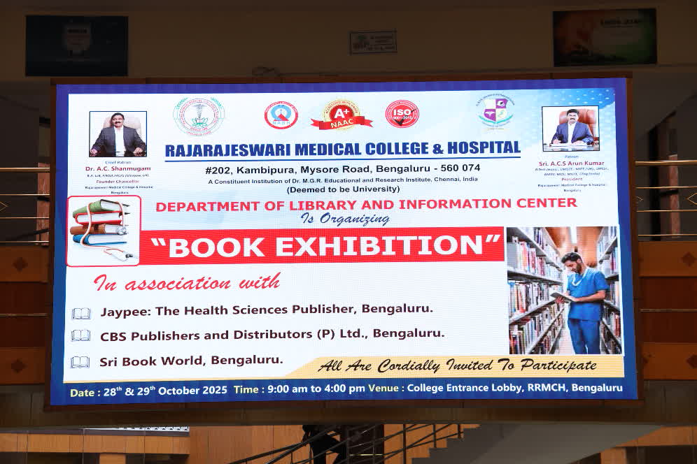 The Department of Library and Information Centre, Rajarajeswari Medical College & Hospital, organized a vibrant Book Exhibition on 28th and 29th October 2025. The event aimed to create awareness among students and faculty about the latest editions and newly published titles in the field of medical and health sciences.
