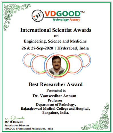 Dr. Vamseedhar Annam, Dept of Pathology, RajaRajeswari Medical College and Hospital has been awarded with BEST RESEARCHER AWARD’ by 10th International Scientist Awards on Engineering, Science and Medicine, Hyderabad, India, 27.09.2020.