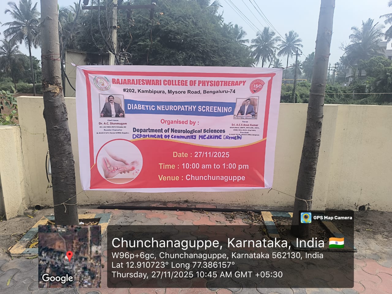 The Department of Community Medicine, Rajarajeshwari Medical College & Hospital (RRMCH), in association with Rajarajeshwari College of Physiotherapy, conducted a comprehensive Health Awareness and Screening Camp on Diabetic Neuropathy at the Rural Health Training Centre (RHTC), Chunchankuppe.