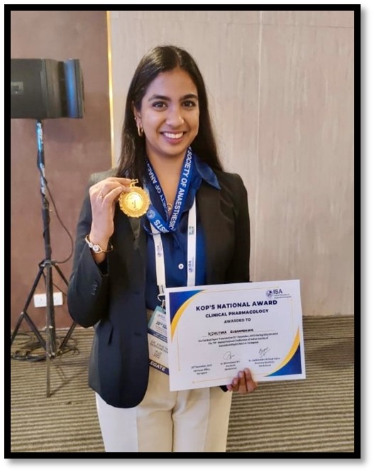 It is very proud to share with you all that Dr. Kshethra Subramoniam final year post graduate, Department of Anesthesiology & Critical Care, RRMCH, under the guidance of Dr. Rangalakshmi S (Professor & HOD), Dr. Sowmya M J (Professor) Dr Shankar K has won the first prize in paper presentation Dr KOPs national award under clinical pharmacology at the 70th annual national conference of Anesthesiologists ISACON 2023 held at Gurgram, Haryana. She was selected amongst 4000 participants all over India.