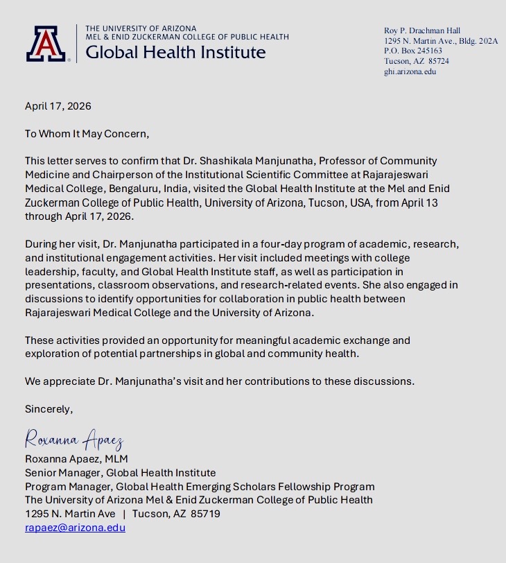 Dr. Shashikala Manjunatha, Professor of Community Medicine and Chairperson of the Institutional Scientific Committee at Rajarajeswari Medical College, Bengaluru, undertook an academic visit to the Global Health Institute at the Mel & Enid Zuckerman College of Public Health, University of Arizona, Tucson, USA, from April 13 to April 17, 2026.