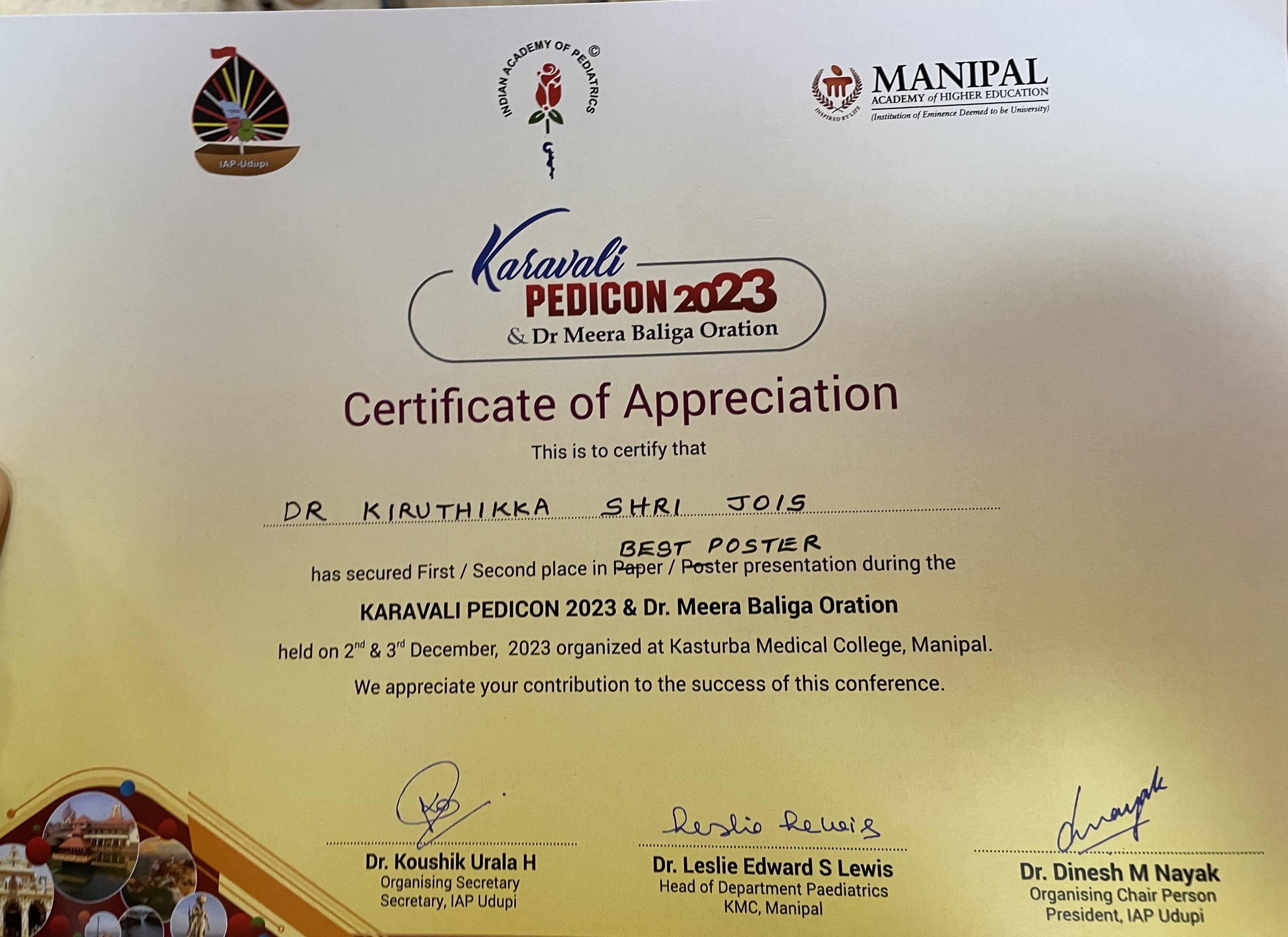 Dr. Kiruthikka shri Jois won best poster presentation for presenting “A Conundram of Goldenberg Shprintzen Megacolon syndrome in a family”.