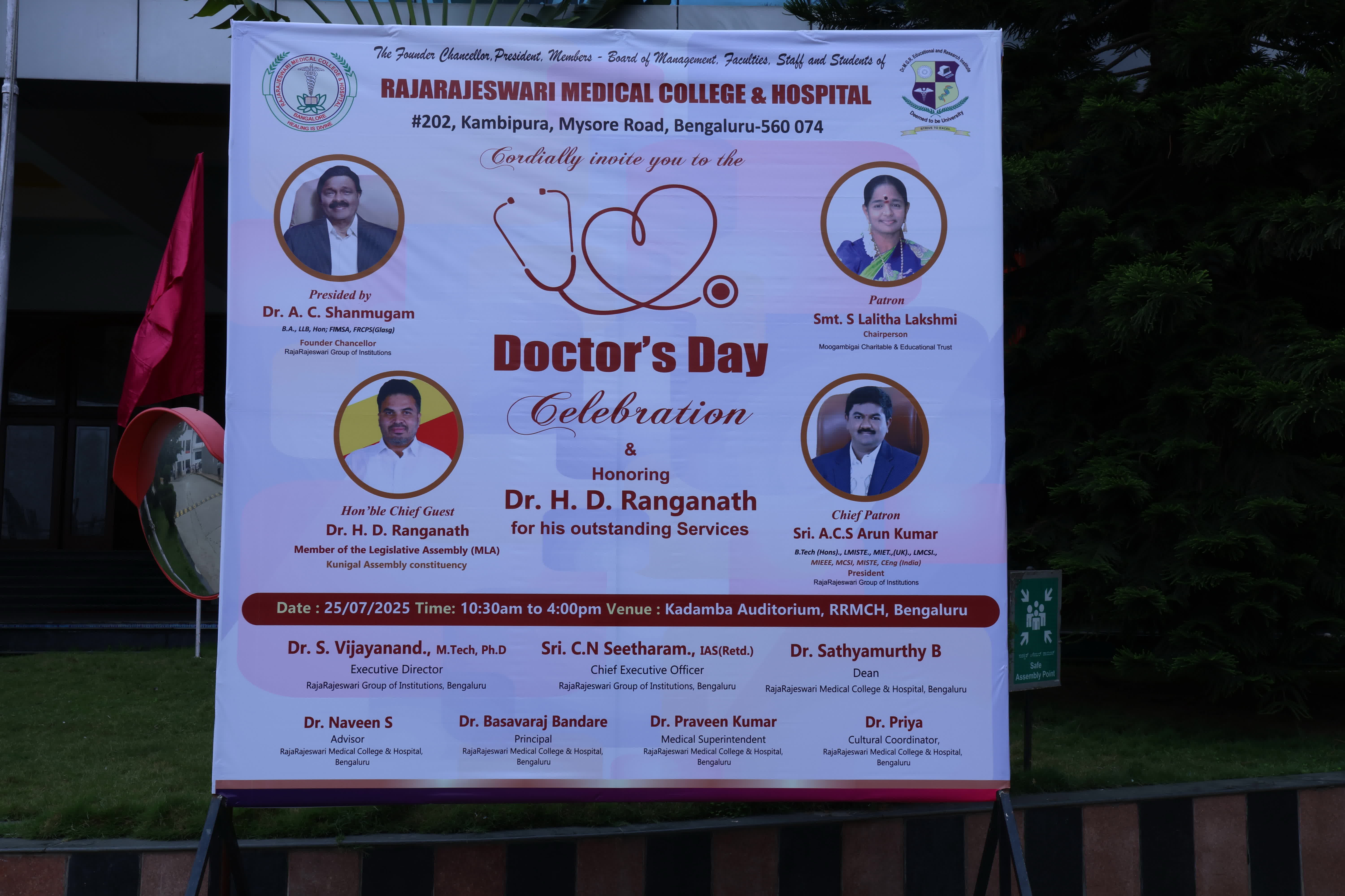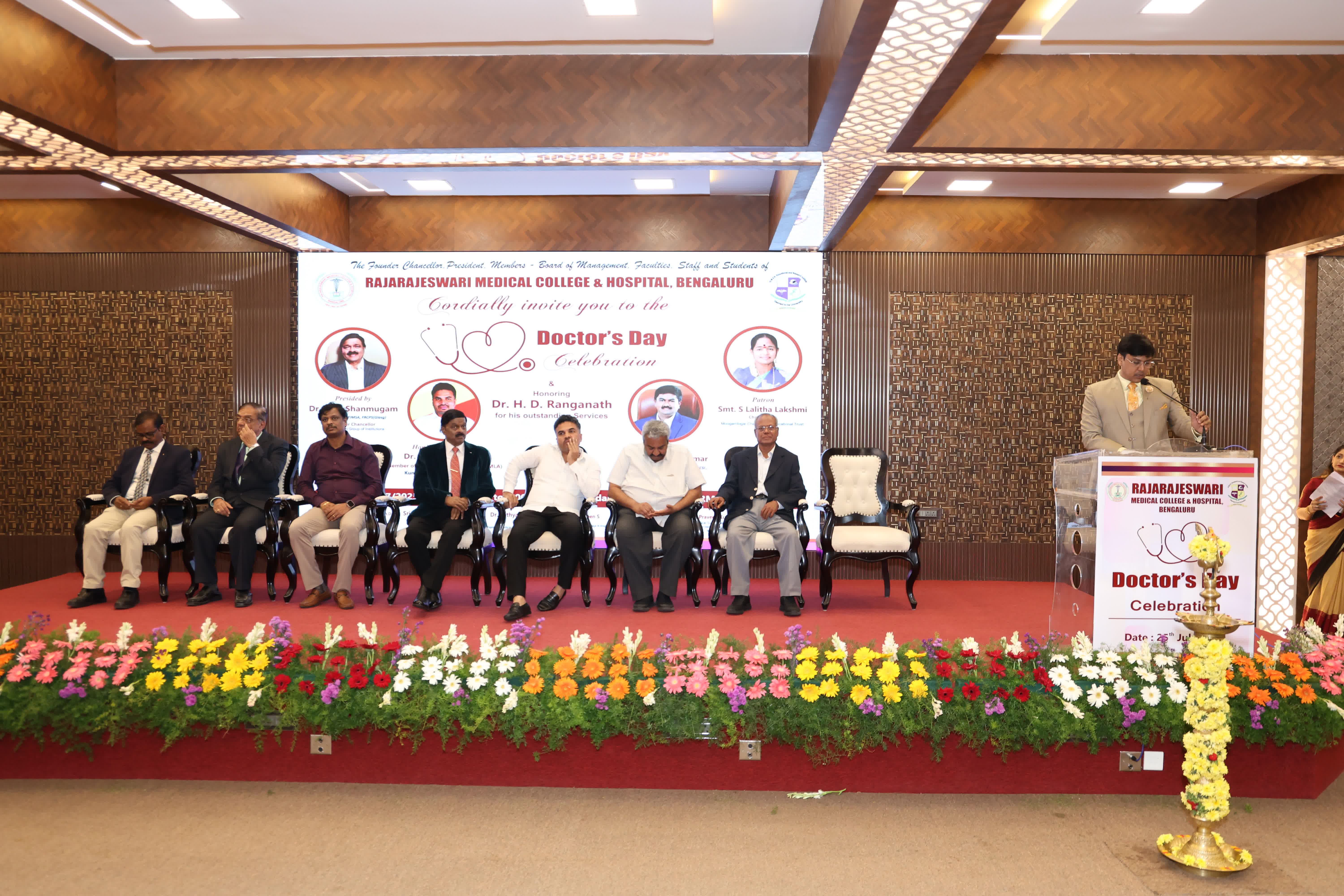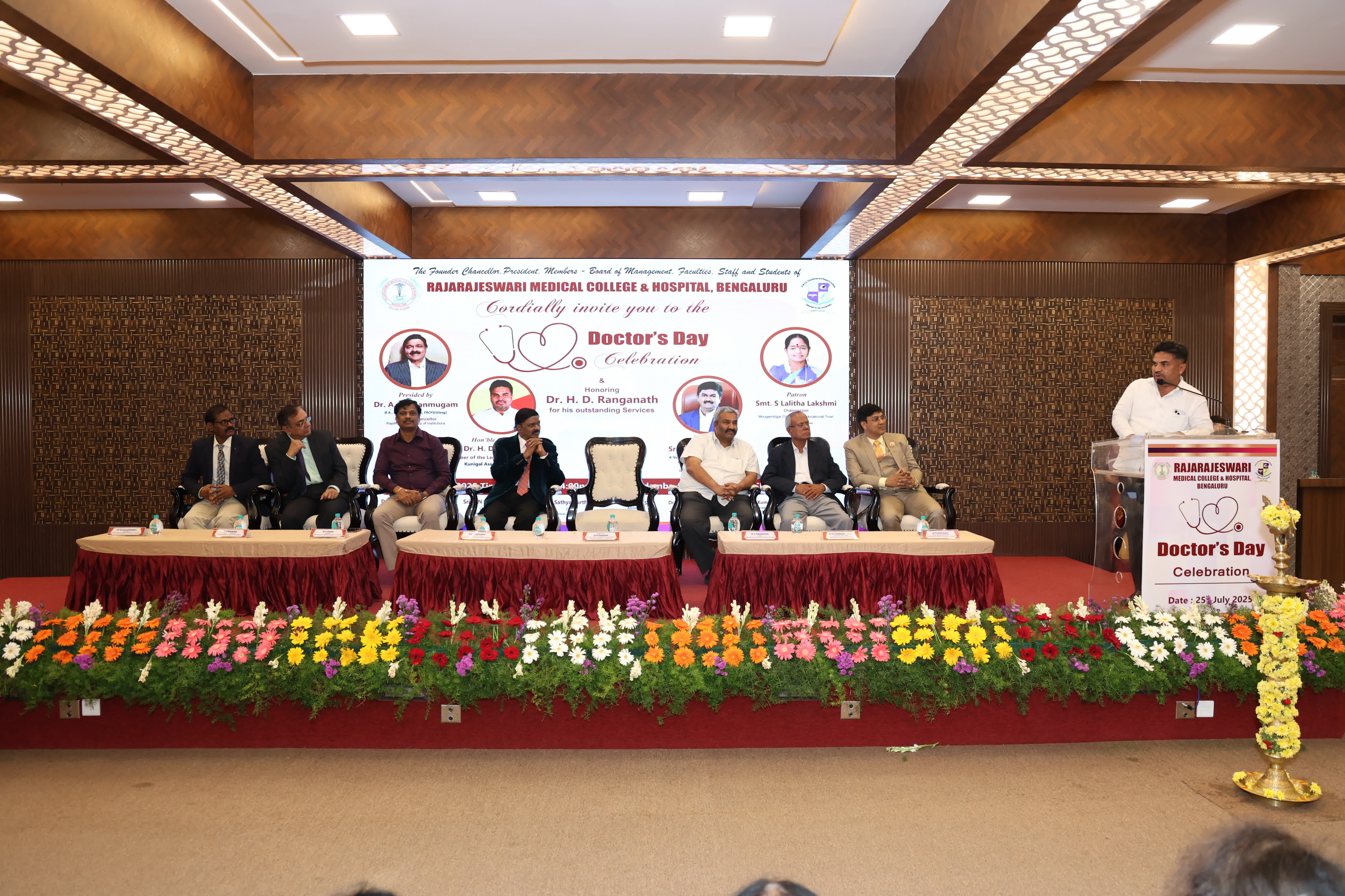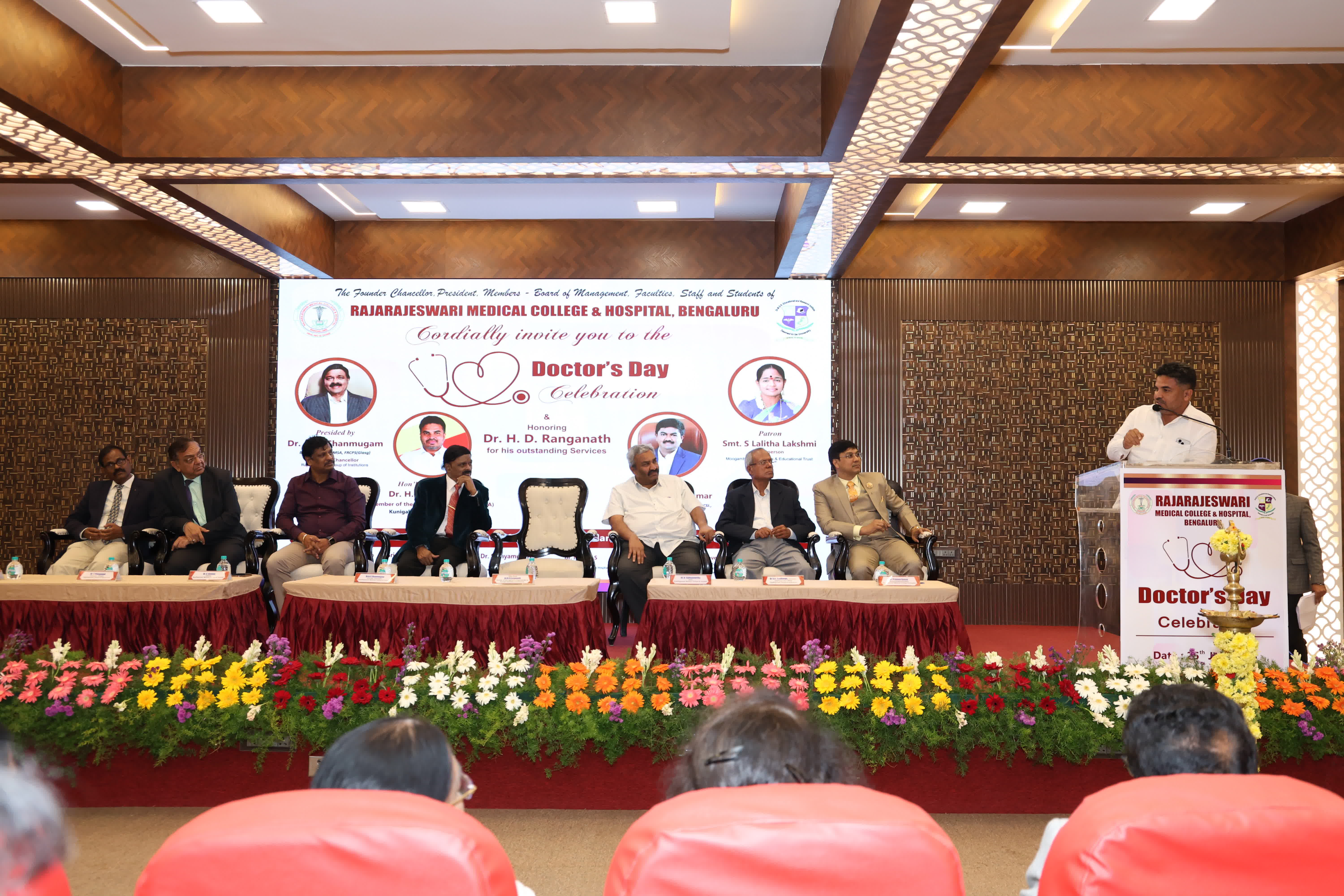 RajaRajeswari Medical College & Hospital celebrated Doctors’ Day on 24th July 2025 at Kadamba Hall with great pride and enthusiasm. The event was honored by the presence of our Founder Chancellor, Dr. A.C. Shanmugham, and Chief Guest Dr. H.D. Ranganth, MLA of Kunigal Constituency.