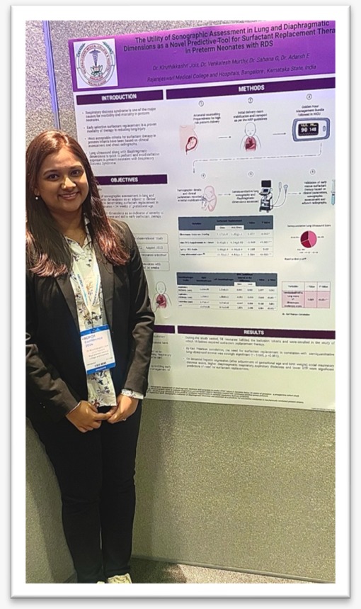 Final year Resident, Dr. Kiruthikka shri Jois, under the guidance of Dr. Adarsh (HOD & Professor), Dr. Sahana G. (Professor Neonatology) and Dr. Venkatesh Murthy (Associate Professor Neonatology) was selected amidst a global cohort to present physical short poster presentation titled – “The utility of sonographic assessment of lung and diaphragmatic dimensions as a novel predictive tool for surfactant replacement therapy in preterm neonates with RDS”.